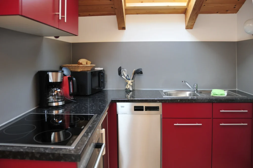 2-4 persons, 50m², attic, living room, kitchen in the hallway, bedroom with double bed, additional sleeping options in the living room (couch), west-facing balcony.