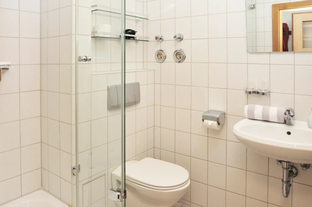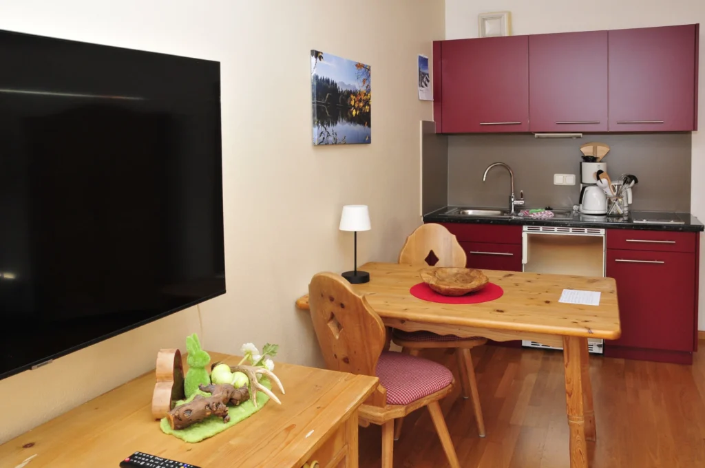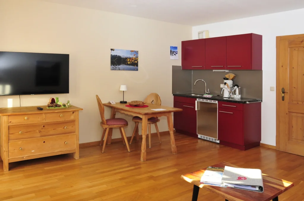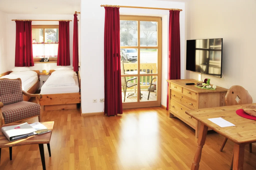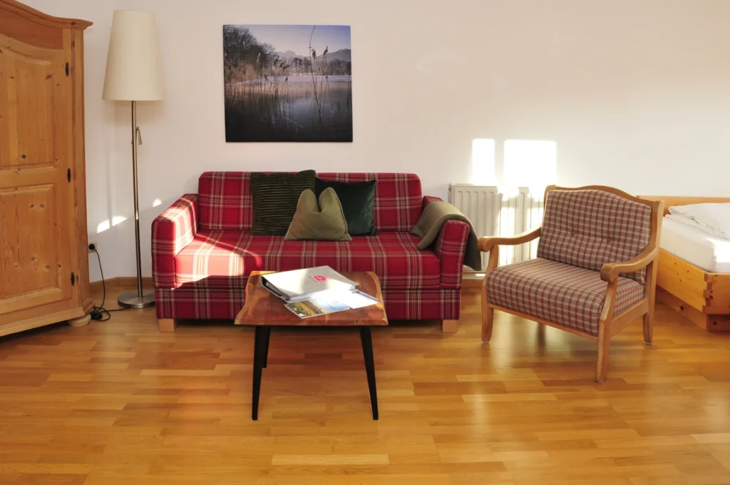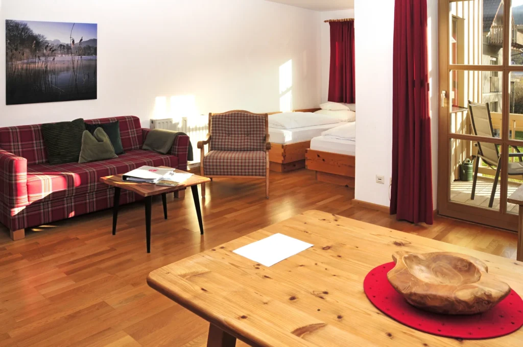 1-2 persons, 33 m², 1st floor, facing south Living room with sofa set, kitchenette, and dining area, sleeping alcove with two single beds, shower with WC, hallway, south-facing terrace.