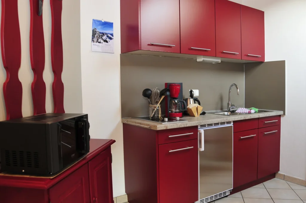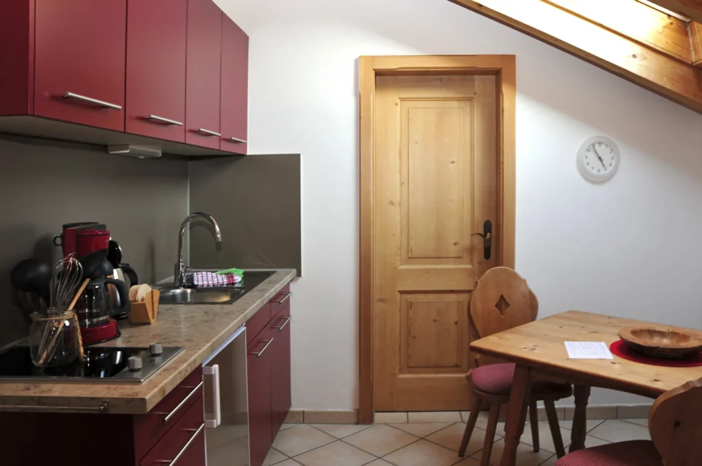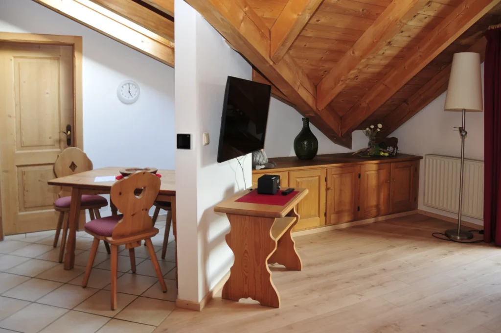 Ferienwohnung für 2 bis 4 Personen. 41 m². 2. Stock, Studio, nach Süden gelegen. Wohnraum mit Couchgarnitur, Küche mit Essplatz, Doppelschlafzimmer, Dusche mit WC, Flur, Südbalkon.